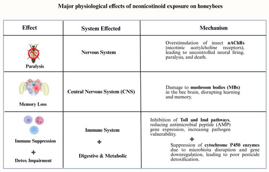 The relationship between neonicotinoids and Varroa destructor, a parasitic mite that impairs honey bee immunity by inhibiting immune gene expression. Bees exposed to neonicotinoids had a markedly increased vulnerability to Varroa mite infestations, which further weaken their defenses against viral infections such as Deformed Wing Virus (DWV) and Israeli Acute Paralysis Virus (IAPV). Varroa infestation and neonicotinoid exposure combined to cause an accelerated colony collapse. Figure 1 summarizes the major physiological effects of neonicotinoid exposure on honeybees across different biological systems.