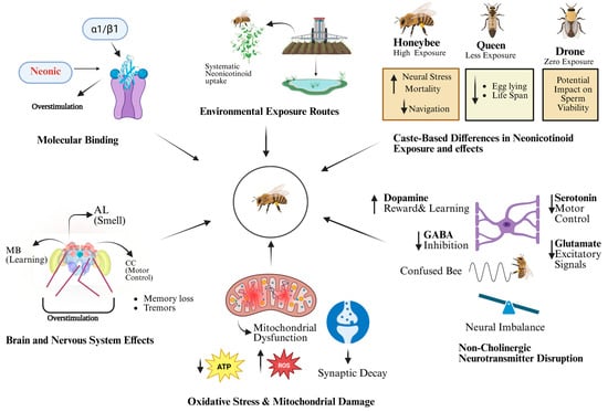 Nicotinic acetylcholine receptors (nAChRs) in insects, such as honey bees, are made up of different combinations of α and β subunits, resulting in several functional subtypes, including α1/β1, α8/β1, and α1/α8/β1 [30]. Different pharmacological sensitivity to neonicotinoid pesticides is conferred by these subunit combinations. For instance, thiacloprid and clothianidin may interact differentially according on the subunit makeup, but imidacloprid exhibits a strong affinity for α1/β1-type receptors [31,32]. Interestingly, insects’ α-bungarotoxin (α-Bgt)-sensitive nAChRs match receptors with α7-like subunits, which reflect high-affinity neonicotinoid binding sites and structurally resemble vertebrate α7 [33]. The principal excitatory neurotransmission system in insects, the cholinergic system controls vital functions like motor control, memory and learning, olfactory processing, sensory integration, and spatial navigation [24]. Cholinergic neurons and nicotinic acetylcholine receptors (nAChRs) are abundantly expressed in three important brain regions in honey bees: the central complex (CC), which mediates motor control and navigation; antennal lobes (ALs), which process smells; and mushroom bodies (MBs), which are involved in memory and learning [34]. Normal cholinergic signaling in insect nAChRs is disrupted by neonicotinoids, which function as agonists at these receptors. Reduced learning capacity, impaired memory formation, disturbed olfactory processing, and navigational errors that show up behaviorally as confused foraging, an inability to do the waggle dance, and decreased colony survival are the outcomes of this [35].