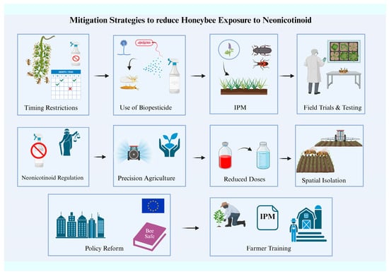 A number of new tactics are being acknowledged for their efficacy in lowering honeybee exposure to neonicotinoids, in addition to biopesticide substitution and integrated pest management (IPM). Habitat restoration and enhancement, which includes the establishment and maintenance of pollinator-friendly habitats such buffer zones, hedgerows, and wildflower strips, is one of the most promising strategies. Particularly in regions where farmland predominates, these natural landscapes serve as barriers to chemical drift in addition to providing uncontaminated fodder, hence lowering exposure [145]. Furthermore, solutions for reducing off-target pesticide application have evolved in the form of precision agriculture technologies, including as AI-based monitoring systems and GPS-guided spraying. Even sublethal concentrations of neonicotinoids dramatically limit pollen foraging activity, according to studies utilizing AI-assisted models, highlighting the significance of focused, regulated chemical application [146]. Furthermore, since scientists discover that pollinators are regularly exposed to a broad range of agrochemicals, not just neonicotinoids, chemical substitution and lower pesticide doses are becoming more popular. The cumulative dangers to bees can be significantly decreased by using less toxic substances or using smaller dosages [147]. Limiting direct interaction with pesticides can also be achieved through temporal and spatial isolation, such as changing planting schedules or physically separating treated and pollinator-attractive crops. Monitoring studies, for instance, showed geographical heterogeneity in pesticide contamination in pollen and nectar, bolstering planting site and time management techniques [148]. Additionally promising are developments in bee-protective pesticide formulations, including polymer coatings and stereoisomeric chemicals. Honeybee metabolic and detoxification pathways have been discovered to be less disrupted by modified chemical structures, indicating a new approach for safer pesticide production [149]. In addition, bees may be protected from pesticide-induced stress by artificial nutrition and supplementation, such as the supply of diets high in protein and micronutrients. Research has shown that exposure to pesticides alters the gut microbiota, which is necessary for immune function. This emphasizes the necessity of dietary therapies to restore gut health [150]. Although efforts have been made to produce resistant honeybee strains through genetic breeding, studies show that pesticide-induced vulnerabilities cannot be mitigated by more genetic variety alone. When treated to neonicotinoids, even genetically diverse colonies were more vulnerable to parasite infestations [151]. Consequently, regulatory reforms are also crucial. The establishment of more practical safety guidelines requires updated risk assessment models that take into account chronic and sublethal consequences, such as disturbances to immune function, cognition, and circadian rhythms [110]. Finally, a key component of successful mitigation continues to be farmer education and training. A recent systematic analysis highlights the necessity of reevaluating farming methods and giving priority to educating farming communities about pollinator-friendly practices and knowledge [152]. Together, these cutting-edge tactics provide a thorough framework for safeguarding honeybee populations in traditional and non-traditional agricultural systems. Figure 4 illustrates the several key mitigation strategies discussed, providing a visual overview of their role in reducing honeybee exposure to neonicotinoids.