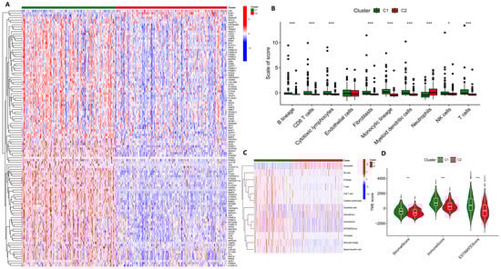 Analysis of the immune microenvironment in different HCC subtypes. (A) Comparison of DEGs of two HCC subtypes by unsupervised clustering. (B) Comparison of the results for the two HCC subtypes using the MCPcounter algorithm. (C) Heatmap of the immune cell scoring using the MCPcounter algorithm. (D) Comparison of the tumor microenvironment of the two HCC subtypes using the ESTIMATE algorithm. * p < 0.05, ** p < 0.01, *** p < 0.001.