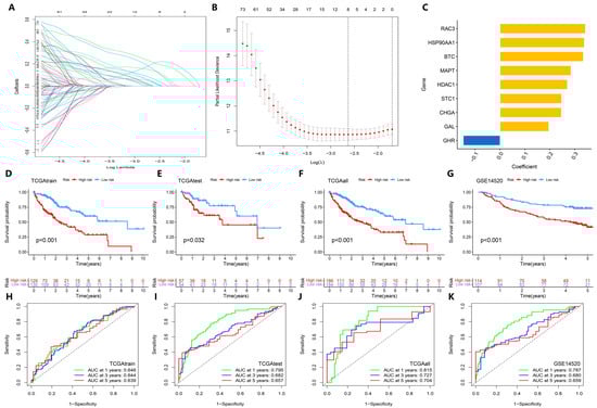 Construction and overall performance evaluation of the prognosis prediction model. (A) LASSO regression coefficient distribution map; one line represents one gene. (B) Distribution plot of the LASSO regression parameters. (C) Bar chart showing the model coefficients of the selected signature genes. (D–G) Kaplan–Meier curve analysis of high-risk and low-risk HCC patients in each dataset, including internal datasets TCGAtrain, TCGAtest, and TCGAall, and the external GEO test dataset GSE14520. (H–K) ROC curves at 1, 3, and 5 years in each dataset.