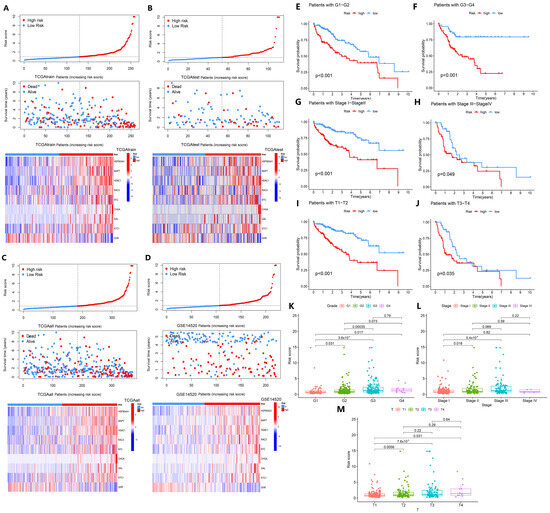 Analysis of basic clinical features associated with the high- and low-risk groups. (A–D) Risk curves, survival status, and prognostic signatures heatmap in TCGAtrain, TCGAtest, GEOtest (GSE14520), and TCGAall datasets. (E,F) Kaplan–Meier curve analysis of pairwise comparisons of G1 to G2 and G3 to G4 between high-risk and low-risk groups. (G,H) Kaplan–Meier curve analysis of pairwise comparisons of stage I to stage II and stage III to stage IV between high-risk and low-risk groups. (I,J) Kaplan–Meier curve analysis of pairwise comparisons of T1 to T2 and T3 to T4 between high-risk and low-risk groups. (K–M) Comparison of different grades, different stages, and different T stages.