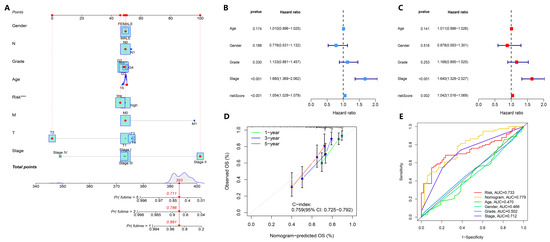 Construction and evaluation of the prediction model-derived nomogram. (A) Nomogram prediction of OS in TCGA-LIHC patients based on prognostic features of nucleotide metabolism and immune DEGs. For each patient, the total score was calculated by adding the scores obtained from the subscales for each variable. On the basis of the total score, the underlying scale was used to predict the probability of survival at 1, 3, or 5 years. The red line indicates the calculation process and the principle of the nomogram. (B,C) Univariate and multivariate Cox regression analysis of risk scores and various clinical characteristics. (D) Calibration curve between predicted and actual survival at 1, 3, and 5 years. (E) ROC curves of the 1-year, 3-year, and 5-year survival rates of TCGA-LIHC patients, including the nomogram. *** p < 0.001.