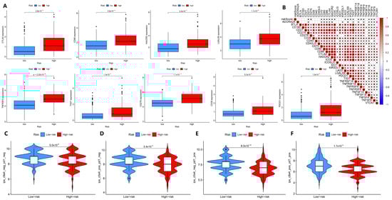 The effectiveness of the prognostic model assessing immune status and immunotherapy efficacy. (A) Comparison of the expression of immune checkpoint-related genes in TCGA-LIHC patients between high-risk and low-risk groups (only 9 genes were listed). (B) Correlation analysis of risk scores and immune checkpoint-related genes in TCGA-LIHC patients. (C–F) Comparison of the immunotherapy effects in TCGA-LIHC patients in the high-risk and low-risk groups when receiving PD-1 and CTLA-4 alone or in combination (GES10141 dataset). * p < 0.05.