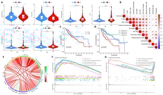 Exploration of tumor immunity-related biological factors. (A) Comparison of immune cells between the high- and low-risk groups of TCGA-LIHC patients. (B) Correlations between the relative abundance of immune microenvironment-related cell types and the risk score. (C,D) Survival rate and Kaplan–Meier curves of high-TMB and low-TMB groups, and high-risk and low-risk groups in TCGA-LIHC patients. (E) Correlation analysis of TMB, MSI, and immune cell infiltration in patients with TCGA-LIHC. (F,G) KEGG enrichment analysis in the high-risk and low-risk groups of TCGA-LIHC patients. * p < 0.05.