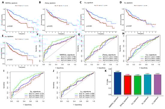 Comparison of model predictive performance with the previous prognostic signatures. (A–E) Kaplan–Meier curve analysis of all prediction models, including the prediction models published in the references. (A–E) are NMIRGs_signature (our model), Zhang_signature, Cui_signature, Su_signature, and Lu_signature, respectively. (F–J) ROC curves of the 1-year, 3-year, and 5-year survival in all prediction models. (F–J) are NMIRGs_signature (our model), Zhang_signature, Cui_signature, Su_signature, and Lu_signature, respectively. (K) C-index analysis of all prediction models.