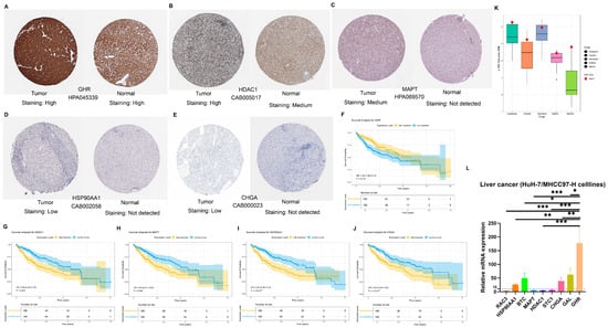 The expression of these nine NMIRG signature genes used in the construction of the model was searched in the HPA online database. We found that the protein levels of eight out of nine signature genes (including CHGA, GAL, GHR, RAC3, HSP90AA1, MAPT, HDAC1, and STC1; Supplementary Table S9, Figure 8A–E) had been measured in HCC tissues. Among them, the proteins of GHR and HDAC1 showed strong positivity in HCC tissues, the protein of MAPT was moderately positive in HCC tissues, the proteins of STC1, HSP90AA1, and CHGA showed low positivity in HCC tissues, while RAC3 and GAL did not show expression in HCC tissues (Supplementary Figure S9A–C). No immunohistochemical data on liver cancer were available for BTC protein. Moreover, consistent with the expression of NMIRG proteins retrieved from the HPA database in HCC tissues, the GHR, HDAC1, MAPT, HSP90AA1, and CHGA genes are significantly associated with the prognosis of HCC patients (p < 0.05, Figure 8F–J, Supplementary Figure S9D–F). Among them, HCC patients with low expression of HDAC1, MAPT, HSP90AA1, and CHGA have a better prognosis, while those with low expression of GHR show the opposite, having a worse prognosis (Figure 8F–J). Although there could be some false-negative results among the immunohistochemical data, the prognostic associations of NMIRG signature genes can be at least partly confirmed at the protein level. We analyzed the IC50 values of common liver cancer treatment drugs (Oxaliplatin, Cisplatin, Dabrafenib, Gefitinib, and Afatinib) for liver cancer cell lines in the GDSC database. We found that compared with other liver cancer cell lines, the HuH-7 cell line had higher IC50 values for these five liver cancer treatment drugs, indicating that the HuH-7 cell line has stronger drug resistance (Figure 8K, Supplementary Table S10). Through RT-qPCR detection, the relative expression levels of the NMIRG signature gene mRNA were expressed to different degrees in HuH-7 cell lines, among which the relative expression level of the GHR gene was the highest. Dysregulation of signature genes (e.g., GHR, BTC) in Huh-7 cells (p < 0.05, Figure 8L, Supplementary Table S11), while HPA IHC revealed prognostic protein expression patterns (e.g., low HDAC1/MAPT linked to better survival, Figure 8F–J), supporting our bioinformatic predictions.
