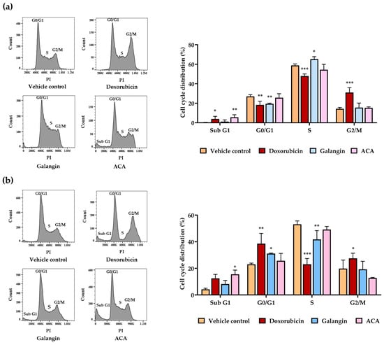 Effect of galangin and ACA Cell Cycle in Raji and Daudi Cells (a) Raji cells at density of 1 × 105 cells/mL treated with galangin and ACA at IC20 concentrations for 48 h, doxorubicin was used as positive control. (b) Daudi cells at density of 2 × 105 cells/mL treated with galangin and ACA at IC20 concentration for 48 h, doxorubicin was used as positive control. Data are expressed as mean ± SD of three independent experiments. Asterisks (*) denote significant differences from vehicle control (* p < 0.05, ** p < 0.01, *** p < 0.001).