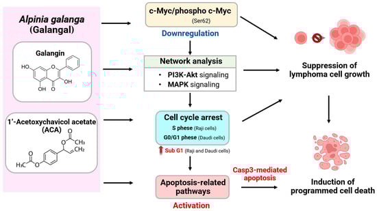 Proposed mechanisms underlying the anti-lymphoma effects of galangin and ACA from galanga. Galangin and ACA exert anti-proliferative and pro-apoptotic effects on Raji and Daudi lymphoma cells through modulation of multiple signaling pathways. Both compounds downregulate c-Myc and p-c-Myc (Ser62), as identified by network analysis implicating PI3K-Akt and MAPK signaling as upstream regulators. These molecular alterations lead to cell cycle arrest—at the S phase in Raji cells, the G0/G1 phase in Daudi cells, and an increase in the sub G1 population in both cell lines–followed by activation of apoptosis-related pathways, including aspace-3 (Casp3)-mediated apoptosis. Collectively, these events contribute to suppression of lymphoma cell growth and induction of programmed cell death.