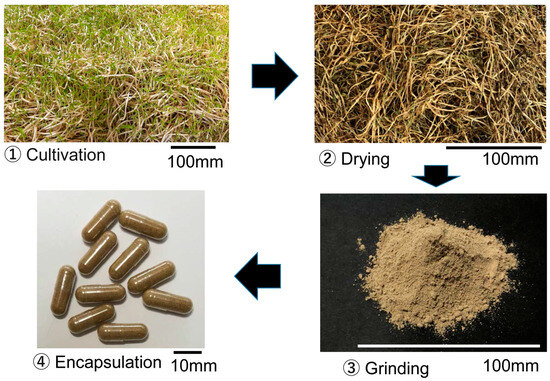 Bean sprouts (Vigna radiata) containing 14 mg of coumestrol per 100 g of fresh weight were cultivated as described previously [14]. The sprouts were dried overnight at 75 °C and powdered using a mixer. Cellulose capsules were filled with 250–300 mg of the resulting bean sprout powder (Qualicaps Co., Ltd., Nara, Japan). Analysis by a certified food analysis center confirmed that the capsules contained no detectable bacteria or aflatoxins (Figure 1).