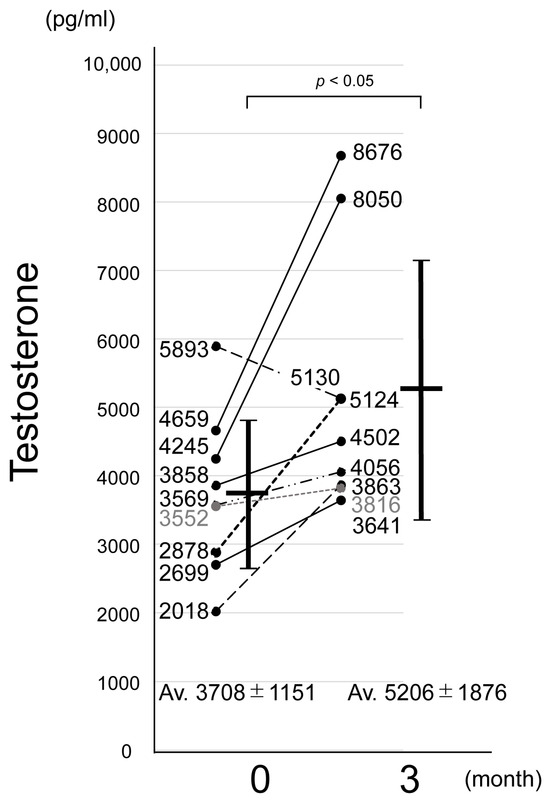 Testosterone exists in three forms in the blood, albumin-bound testosterone (approximately 25–65%), sex hormone-binding globulin-bound testosterone (SHBG) (approximately 35–75%), and free testosterone (approximately 1–3%), with free testosterone being the most biologically active [18]. Total testosterone levels can vary depending on the assay used, due in part to the differences in the sensitivity to protein-bound forms [19,20]. Although testosterone subtypes were not assessed separately in this study, the total testosterone levels measured in the present study using a commercial ELISA kit were consistent with those reported previously by Iwamoto et al., who measured total testosterone in Japanese men by radioimmunoassay (RIA) [19].