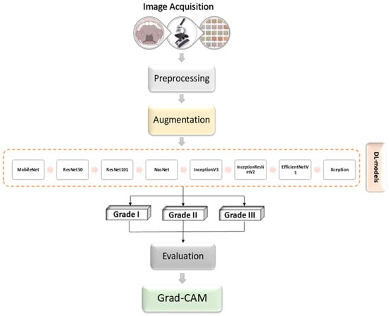 The methodology employed in this research focuses on an extensive analysis of oral cancer images. The procedure involves several steps, including preprocessing and augmenting the data, integrating multiple pretrained AI networks, and utilizing visualization tools like Grad-CAM. Figure 1 provides an overview of the proposed framework.