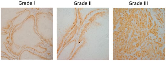 A dataset of 322 histology images with 768 × 768-pixel size was created for this research. The formalin-fixed, paraffin-embedded oral mucosa tissue blocks of histopathological reported cases of OSCC were retrieved from the archives of the Clinical Department of Pathology and Cytology, Clinical Hospital Center in Rijeka. Sample slides were examined and classified in accordance with World Health Organization (WHO) guidelines by two unbiased pathologists [23]. The level of agreement among the pathologists was assessed using the Kappa coefficient. The Kappa coefficient was determined to be 0.94. Images were divided into three classes: Grade I (well-differentiated), Grade II (moderately differentiated) and Grade III (poorly differentiated), as shown in Figure 2.