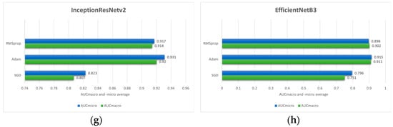 Comparison of the mean AUCmacro and -micro values of three different optimizers (RMSprop, Adam and SGD) on pre-trained models: (a) ResNet50; (b) ResNet101; (c) NASNet; (d) Xception; (e) InceptionV3; (f) MobileNetV2; (g) InceptionResNetV2 and (h) EfficientNetB3.