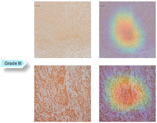 As seen in Figure 5, Figure 6 and Figure 7, Grad-CAM is utilized to create heatmaps that identify key areas in histopathology images for multiclass classification. It captures gradients related to specific output classes, such as Grade I, Grade II, and Grade III, that flow into the final convolutional layers. To create a localization map, these gradients are pooled channel-wise, emphasizing important regions for class prediction. Heatmaps are created by forward passing an image through the network, computing gradients in relation to feature maps, spatially pooling these gradients, and combining weights with activation maps. Clinically, these heatmaps help differentiate pathologically significant features from possible artefacts or irrelevant regions by visually validating the model’s focus on important regions. Grad-CAM helps health professionals make accurate decisions by improving the validation and transparency of AI-driven diagnostic analyses.