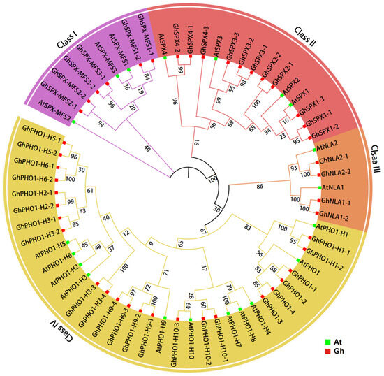 To illustrate the evolutionary relationship among SPX homologs in Arabidopsis and G. hirsutum, a phylogenetic tree was constructed comprising 44 GhSPXs in G. hirsutum and 20 AtSPXs in Arabidopsis. A total of 44 GhSPXs were named based on the corresponding Arabidopsis homologs. According to the phylogenetic tree, it clustered into four subclasses (Figure 1). Classes I, II, III, and IV contained 6, 11, 4, and 23 subfamily members, respectively. Class IV contained the most members, whereas class III contained the least. A phylogenetic analysis showed that SPX family members are highly conserved in different plants.