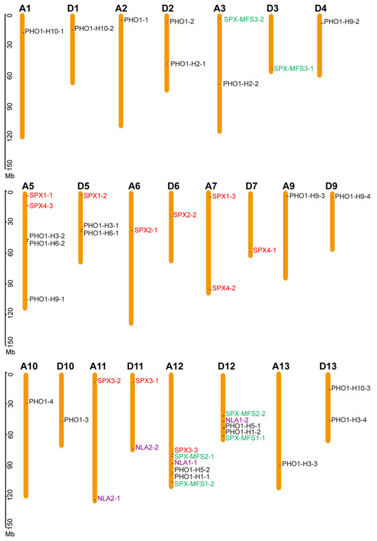 Chromosomal location of GhSPX genes on 23 chromosomes. The chromosome number is shown on the top of each chromosome. The scale bar indicates the length in megabases (Mb). The colors of GhSPXs means these GhSPXs from different subfamilies.