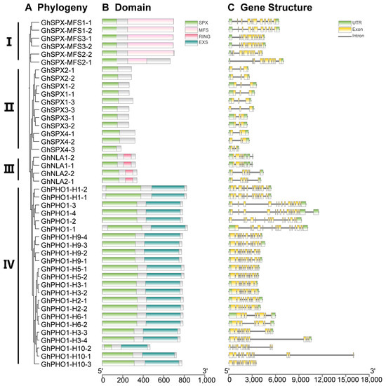 In order to understand the DNA and protein sequence characteristics of cotton SPX family members, we analyzed their gene structure and protein domain. According to the phylogenetic tree, all GhSPX proteins were divided into four classes, including class I (SPX-MFS), class II (SPX), class III (NLA), and class IV (PHO1) (Figure 3A). Next, a protein domain analysis showed that all SPX proteins were divided into four classes according to C-terminal domain, including SPX, SPX-EXS, SPX-MFS, and SPX-RING (Figure 3B), consistent with the previous studies in Arabidopsis and wheat [36,44]. The structure of GhSPX genes was analyzed based on their UTR, exon, and intron. Most GhSPXs exhibited similar exon–intron organization. The SPX-MFS subfamily contains 10 exons, and SPX-RING contains 5–6 exons. SPX-EXS subfamily genes contain the largest number of exons (7–14), whereas SPX subfamily genes contain the fewest, only having two exons (Figure 3C). These results suggest that the SPX is the most conserved domain, and EXS is the most variable domain in cotton SPX family members.