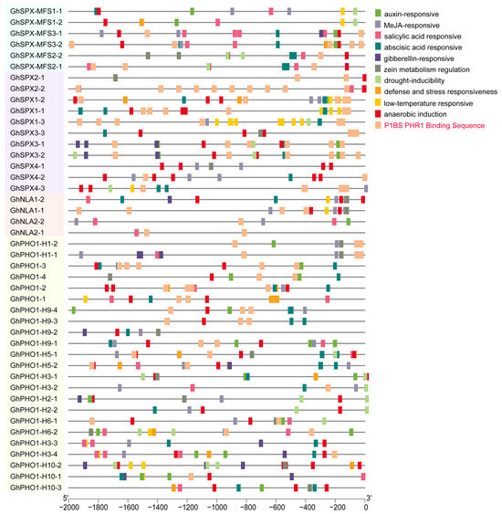 Cis-regulatory elements play important roles in the global regulation of gene expression, and genes with similar expression patterns may contain the same regulatory elements in their promoters. The promoters of 44 GhSPX genes were analyzed using the online software PlantCARE. Various types of cis-acting elements, including hormone response, stress response, low-temperature response, and PHR1 binding sequence elements, were detected in the promoter regions of GhSPX genes (Figure 4), and most GhSPX genes contained more than one cis-element type in their promoter regions, suggesting that these GhSPX genes may be involved in complex regulatory networks. The PHR1 binding sequence (P1BS), which contained an imperfect palindromic 8-bp sequence (GNATATNC) and was a conserved cis-element responding to Pi stress, was significantly enriched in the promoters of GhSPXs (Figure 4). The promoter region of SPX subfamily genes and SPX-EXS subfamily genes (includ PHO1, PHO1-H1, and PHO1-H9) has more P1BS cis-elements, and these P1BS cis-elements are closer to the start codon of SPX-EXS subfamily genes. These results suggest that these SPX-EXS subfamily genes may be regulated by GhPHR1 via GhPHR1 binding to P1BS cis-elements in promoter regions.