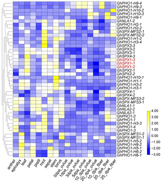 The tissue expression specificity of the GhSPX and GhPHR genes were analyzed by using RNA sequencing data of Gossypium hirsutum ‘TM-1’ [41] during different development stages and the downloaded stress treatments. The detailed cotton tissue samples come from the leaves, roots, and stems of 2-week-old Gossypium hirsutum ‘TM-1’plants; the anther, epicalyx, petal, pistil, sepal, and torus of whole mature flowers of Gossypium hirsutum ‘TM-1’plants; the cotton ovules from 0, 1, 3, 5, 10, and 20 day post anthesis; and the cotton fibers from 10, 20, and 25 day post anthesis. Libraries were sequenced at 2 × 100 bp on the Illumina HiSeq 2000 platform (Illumina, San Diego, CA, USA). To screen GhSPX and GhPHR genes in response to low phosphorus stress, the differential expression gene of low-phosphorus stress in Gossypium hirsutum were used [42]. The normalized expression values of the Fragments Per Kilobase of exon model per Million mapped fragments (FPKM) were z-score-transformed and clustered using Euclidean distance with complete linkage. Color gradients represented relative expression levels (red: up-regulated; blue: down-regulated). The heatmap was annotated with sample groups and key gene clusters. Visualization expression levels were optimized using the R-4.5.0 package pheatmap 1.0.12.