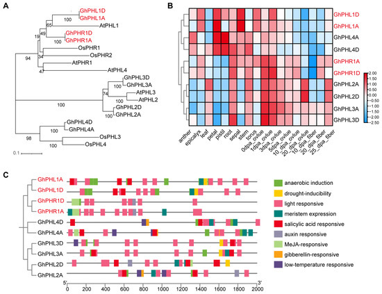 Basic information of some GhPHR genes in cotton. (A) Phylogenetic tree analysis of 5 Arabidopsis thaliana PHR-related genes, 4 rice PHR-related genes, and 10 cotton PHR-related genes. (B) Expression analysis of 10 GhPHR-related genes in different tissues and at different developmental stages. Red and blue colors indicate low and high transcriptional expression levels, respectively. dpa, day post anthesis. (C) Analysis of promoter cis-acting elements of 10 GhPHR related genes.