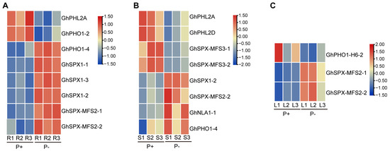 Expression levels of GhPHR and GhSPX family members in P abundance and P deficiency. (A) GhPHR and GhSPX family members differentially expressed in roots at different P concentrations. Red and blue colors indicate low and high transcriptional expression levels, respectively. P+, P abundance. P−, P deficiency. (B) GhPHR and GhSPX family members differentially expressed in stems at different P concentrations. (C) GhPHR and GhSPX family members differentially expressed in leaves at different P concentrations.