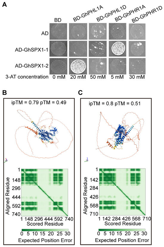 In Arabidopsis, the AtSPX1 shares the SPX domain with yeast Pi sensors, and the SPX1/PHR1 interaction is influenced by Pi directly [14]. To determine whether GhSPX1 interacts with GhPHR1 and GhPHL1 (PHR1-like 1), a Y2H assay was performed. First, we screened the 3AT concentrations that inhibited GhPHL1A-BD, GhPHL1D-BD, GhPHR1A-BD, and GhPHR1D-BD self-activation, which were 20 mM, 50 mM, 5 mM, and 30 mM, respectively. Then, GhSPX1-AD and GhPHR1-BD were co-transferred to yeast cells and SD-Trp-Leu-His-Ade selected media with different 3AT concentrations were used to verify the interaction. Only GhSPX1-1-AD/GhPHR1A-BD and GhSPX1-2-AD/GhPHL1A-BD can grow on the selected media (Figure 8A). A further interaction structural model of GhSPX1-1 and GhPHR1A, and GhSPX1-2 and GhPHL1A was predicted by AlphaFold3.0 to gain additional insight into the nature of these two interactions (Figure 8B,C). These results suggest that GhSPX1-1 interacts with GhPHR1A and GhSPX1-2 interacts with GhPHL1A.