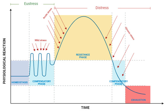 When the intensity of the stressor increases, acute stress arises, resulting in pronounced physiological imbalances, including hormonal shifts and metabolic alterations [40,42]. This level of stress, along with chronic stress, is categorized as distress, as it exceeds the body’s adaptive capacity and can lead to adverse effects. In the acute stress state, the body enters the resistance phase, where it attempts to re-establish equilibrium or homeostasis [34]. However, with prolonged or chronic exposure to stressors, the adaptive mechanisms of the organism become exhausted, ultimately reaching an exhaustion phase that may lead to decline or even death [33,42,43].