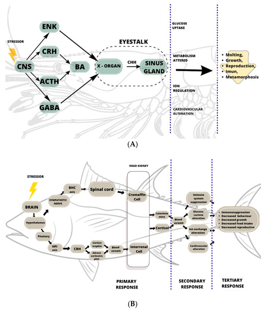 There are distinctions between the primary responses of invertebrates (i.e., crustaceans) and vertebrates (i.e., fish) (Table 2). The distinction between aquatic vertebrates’ and invertebrates’ responses to stress is mainly distinguished by the presence of the vertebrae, hormones, and bioamine products. In crustaceans, the primary response is the rapid and consistent release of crustacean hyperglycemic hormones (CHHs), which have similar effects as cortisol and corticosterone in vertebrates, from the sinus gland in the eyestalks [38,92], which is different from the response in other Arthropods, such as insects. Insects synthesize adepokinetic hormone (AKH) and octopamine (OA) [42] as neurohormones in the brain; these are similar to the neurotransmitter norepinephrine [88]. In vertebrates, such as fish, the primary response involves the secretion and synthesis of corticosteroid hormone (cortisol) and catecholamines (mainly adrenaline and noradrenaline, also known as epinephrine and norepinephrine) in both the hypothalamus and pituitary [34,39].
