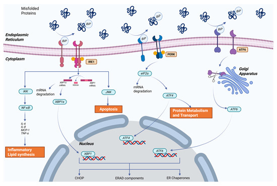 During ER stress, ATF6 is transported from the ER to Golgi, where it is cleaved by the site-1 protease (S1P) and site-2 protease (S2P). The active ATF6 is translocated to the nucleus and binds to promoters of various genes involved in the UPR, regulating the transcription of downstream effectors such as CHOP, BiP, and XBP1 [120,122]. ER stress also activates the ERAD pathway, the calcium signaling pathway, and additional signaling pathways, including the mitogen-activated protein kinase (MAPK) signaling pathway [122]. Similarly to IRE1 pathway, ATF6 initiates the transcription of HSP and ERAD components [124] (Figure 3).