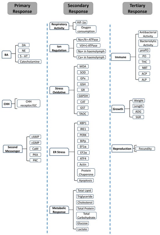 The secondary response of stress in both vertebrates and invertebrates involves hormonal changes that circulate through the bloodstream or hemolymph, impacting several signaling pathways and leading to metabolic alterations. This response is characterized by the release of stress hormones, such as cortisol, adrenaline (epinephrine), non-adrenaline (norepinephrine), and crustacean hyperglycemic hormone. These hormones target organs like the hepatopancreas, hemocytes, and muscles, influencing physiological processes [94,102].