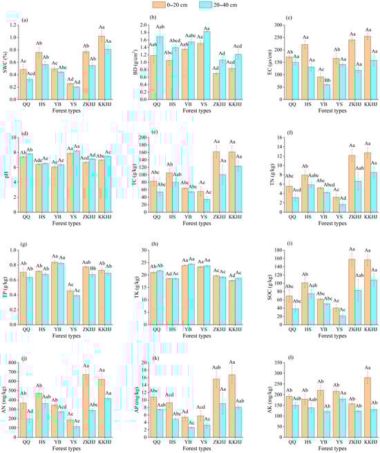 In terms of differences based on soil layers, the 0–20 cm topsoil across all six forest types exhibited higher values of SWC, EC, TC, TN, TP, SOC, AN, AP, and AK than did the 20–40 cm subsoil layer. Conversely, topsoil exhibited lower bulk density (BD) and pH compared to the subsoil layer. Most forest types showed a higher TK content in the 20–40 cm layer than in the 0–20 cm layer, except for the ZKHJ, where the TK content was relatively high in the topsoil. Overall, the variation trends of soil physical and chemical properties between the two soil layers were generally consistent across the six forest types.