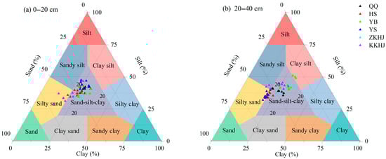 Overall, the soils were dominated by silt particles (38.80%), followed by sand (36.13%), whereas the clay content was relatively low (25.08%) (Figure 2). Both the QQ and ZKHJ forests exhibited relatively compact and balanced particle size distributions in both soil layers, mainly clustered within the “sand–silt–clay” zone, indicating a well-structured soil texture. The HS forest had particle size distributions mainly between the “sand–silt–clay” and “silty sand” zones, with a slight shift toward sand compared to the QQ forest, suggesting a relatively loose soil structure. The YB forest showed relatively high proportions of silt and clay, and some subsoil (20–40 cm) samples fell into the “clay silt” zone, indicating a fine texture in deep soil layers. The YS forest had particle size distributions between the “sand–silt–clay” and “silty sand” zones, with relatively high sand content observed in the 20–40 cm soil layer. In contrast, the KKHJ forest exhibited a highly dispersed distribution, with samples spanning multiple texture zones including “sand–silt–clay”, “sandy silt”, and “clay silt”, indicating a relatively complex soil physical structure in the understory.