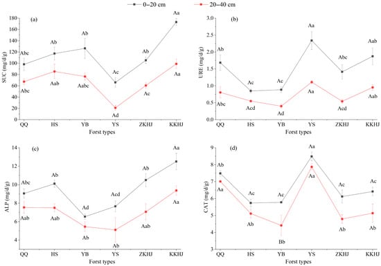 Soil enzyme activities under different forest types and soil depths (n = 9). (a) SUC: sucrase; (b) URE: urease; (c) ALP: alkaline phosphatase; (d) CAT: catalase. Uppercase letters indicate significant differences in soil physicochemical properties between different soil depths within the same forest type, while lowercase letters represent differences between different forest types at the same soil depth (p < 0.05). Bars sharing the same letter indicate no significant differences (p > 0.05). The error bars show the standard error of the mean. QQ: pure forest of Picea wilsonii; HS: pure forest of Betula; YB: pure forest of Juniperus squamata; YS: pure forest of Pinus tabuliformis; ZKHJ: mixed coniferous and broadleaved forest; KKHJ: mixed broadleaved forest.