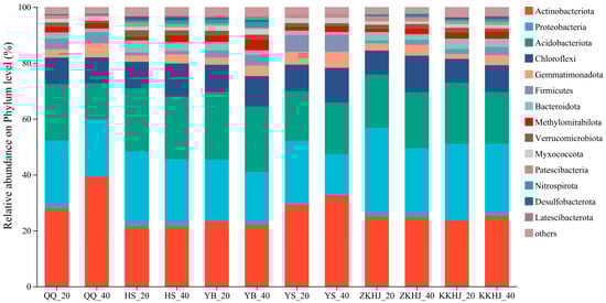 Relative abundance of soil bacterial communities under different forest types and soil layers (n = 9). The suffixes _20 and _40 refer to the 0–20 cm and 20–40 cm soil layers, respectively. QQ: pure forest of Picea wilsonii; HS: pure forest of Betula; YB: pure forest of Juniperus squamata; YS: pure forest of Pinus tabuliformis; ZKHJ: mixed coniferous and broadleaved forest; KKHJ: mixed broadleaved forest.
