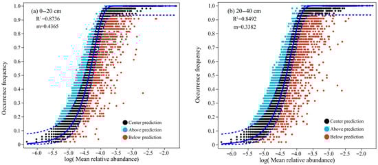 The bacterial neutral community model (NCM) under different forest types and soil layers (n = 54). (a) 0–20 cm. (b) 20–40 cm.