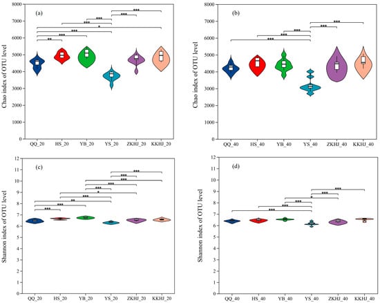 Variation in soil bacterial alpha diversity across forest types and soil layers (n = 9). (a) Chao index of soil bacteria in the 0–20 cm soil layer; (b) Chao index of soil bacteria in the 20–40 cm soil layer; (c) Shannon index of soil bacteria in the 0–20 cm soil layer; (d) Shannon index of soil bacteria in the 20–40 cm soil layer. The suffixes _20 and _40 indicate the 0–20 cm and 20–40 cm soil layers, respectively. The error bars represent the standard error of the data. Asterisks indicate significant differences between forest types for the same soil layer and parameter: * 0.01 < p ≤ 0.05, ** 0.001 < p ≤ 0.01, *** p ≤ 0.001. QQ: pure forest of Picea wilsonii; HS: pure forest of Betula; YB: pure forest of Juniperus squamata; YS: pure forest of Pinus tabuliformis; ZKHJ: mixed coniferous and broadleaved forest; KKHJ: mixed broadleaved forest.