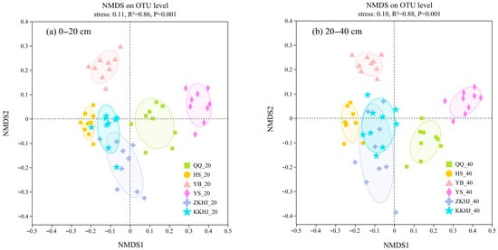 NMDS ordination depicting differences in soil bacterial community composition across forest types and soil layers (n = 9). The suffixes _20 and _40 refer to the 0–20 cm and 20–40 cm soil layers, respectively. QQ: pure forest of Picea wilsonii; HS: pure forest of Betula; YB: pure forest of Juniperus squamata; YS: pure forest of Pinus tabuliformis; ZKHJ: mixed coniferous and broadleaved forest; KKHJ: mixed broadleaved forest. (a) 0–20 cm. (b) 20–40 cm.