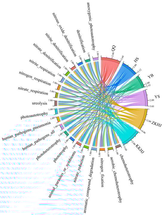 Using 16S rRNA gene-based taxonomic classification combined with functional annotation through the FAPROTAX database, a total of 63 putative functional groups were identified across soil bacterial communities from the six forest types. The 20 most abundant functions within each forest type were selected for visualization via chord diagrams (Figure 8), which highlighted distinct differences in functional composition between the forest ecosystems. These functions primarily clustered into three categories: (1) C and N metabolism (e.g., chemoheterotrophy and nitrogen fixation), (2) compound degradation (e.g., aromatic compound degradation), and (3) other specialized metabolic processes (e.g., anoxygenic photoautotrophy). Among the forest types, QQ and the two mixed forests (ZKHJ and KKHJ) exhibited relatively high bacterial functional diversity and redundancy, encompassing a broad range of ecological processes such as N cycling, organic matter decomposition, and C fixation. In contrast, the HS and YB forests showed relatively high functional representation associated with human pathogenicity, suggesting potential ecological risk and the need for further attention. The YS forest displayed relatively narrow functional diversity, with functions primarily related to N metabolism, indicating a highly functionally specialized microbial community. Overall, these findings suggest that forest types significantly shape the composition of soil bacterial functional groups by modifying microhabitat conditions, thereby influencing the functional capacity of forest ecosystems.
