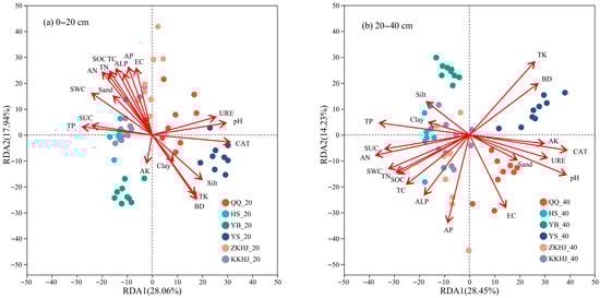 Redundancy analysis (RDA) of soil physicochemical properties, enzyme activities, and bacterial community structure across different forest types and soil layers (n = 9). The suffixes _20 and _40 refer to the 0–20 cm and 20–40 cm soil layers, respectively. QQ: pure forest of Picea wilsonii; HS: pure forest of Betula; YB: pure forest of Juniperus squamata; YS: pure forest of Pinus tabuliformis; ZKHJ: mixed coniferous and broadleaved forest; KKHJ: mixed broadleaved forest. (a) 0–20 cm. (b) 20–40 cm.
