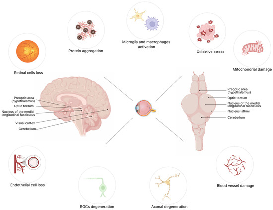 Because the retina is an accessible part of the central nervous system (CNS), it serves as a valuable platform for studying neurodegenerative disorders. Neurological diseases often manifest ocular symptoms due to degeneration of visual pathways, involving photoreceptors, retinal ganglion cells, and other retinal neurons [36]. Brain neurodegenerative processes—such as oxidative stress, neuroinflammation, protein aggregation, and mitochondrial dysfunction—are also reflected in retinal pathology [37].