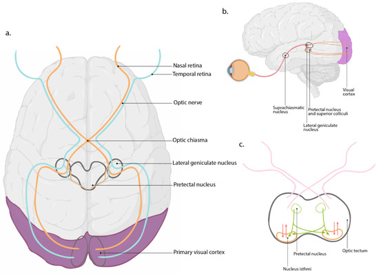 Visual pathway from retina to brain. (a) Superior view of the visual circuit in the human brain. Signals from the nasal retina cross at the optic chiasm, while those from the temporal retina remain ipsilateral. These projections synapse at the lateral geniculate nucleus and then relay to the primary visual cortex. Additional projections reach the pretectal nucleus. (b) Lateral view of the visual circuit in the human brain. (c) Schematic zebrafish visual circuit: The optic tectum is the principal visual processing center in zebrafish, mediating sensorimotor information for visually guided behaviors. The pretectal nucleus, which receives input from the tectum, sends inhibitory projections to the nucleus isthmi, modulating visuomotor reflexes like the optokinetic response. The nucleus isthmi forms reciprocal connections with the optic tectum and contributes to visual attention and stimulus selection.
