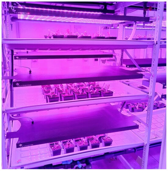 Transplanting was conducted 19 days after sowing (DAS) into individual plastic pots (9 × 9 × 10 cm) containing the same peat–perlite substrate to promote optimal root development and nutrient uptake. Plants were cultivated at a density of 70 plants m−2, maintaining a constant distance of 10 cm between the apical region of the canopy and the light source throughout the experimental period. The experiment was conducted as a single cultivation cycle comprising five light treatments (four EOD treatments and one control), each applied concurrently. Treatments were arranged within a three-level ebb-and-flow hydroponic system, with each level representing one independent replicate (Figure 1). Each treatment included 60 plants, divided into three replicates of 20 plants each. Within each replicate, six plants were designated as primary experimental units, while the remaining fourteen served as buffer plants.