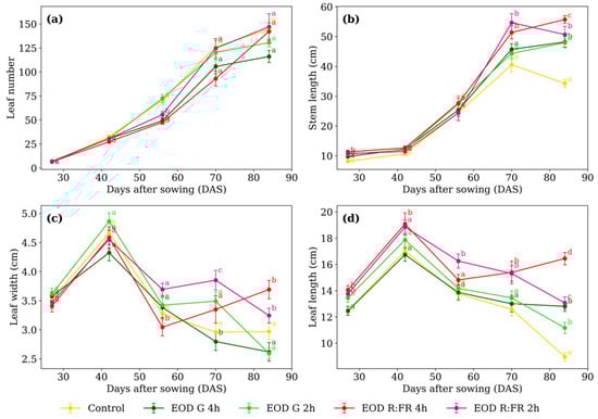 (a) Leaf number, (b) stem length, (c) leaf width, and (d) leaf length of C. officinalis under different light spectra across five measurement periods: 27, 42, 56, 70, and 84 days after sowing (DAS). Data represent means ± standard error of the mean (SEM). Treatments sharing the same letter within each DAS are not significantly different according to Tukey’s HSD test (α = 0.05).