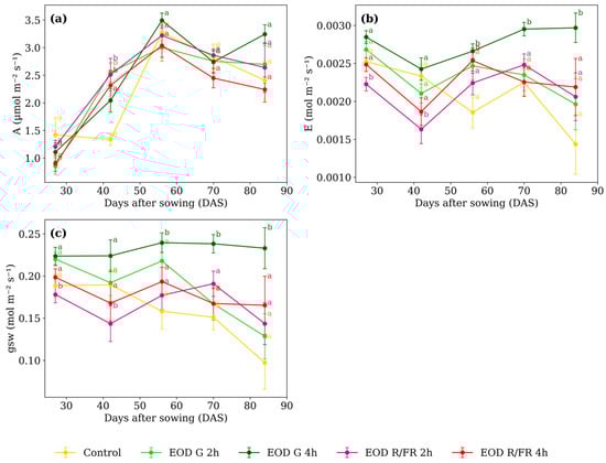 Differences in A (Figure 4a) among treatments were minimal at most developmental stages. However, at 42 DAS, EOD G 4 h and control exhibited lower values, averaging 1.69 µmol m−2 s−1, while the other treatments averaged 2.46 µmol m−2 s−1, corresponding to a 31.2% increase under short-duration G and R:FR light.
