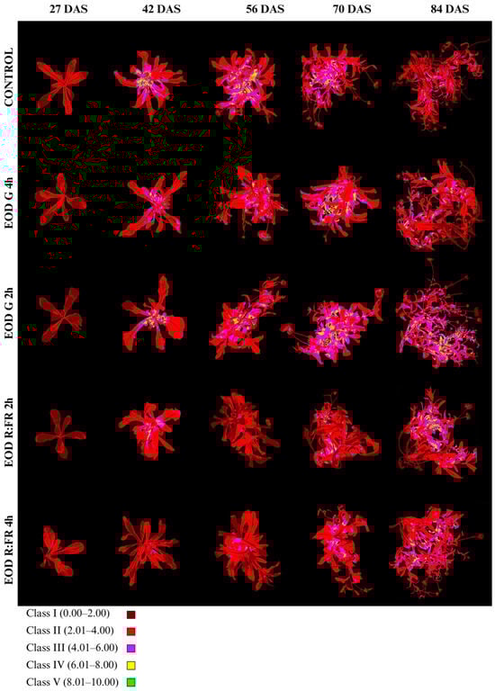 At 27 DAS, all treatments exhibited a predominance of class III, with the proportion of plant area ranging from 76.7% in EOD R:FR 2 h to 84.6% in EOD G 2 h. The highest Chl-Idx at this stage was recorded in EOD G 2 h (0.81 ± 0.12), followed by EOD R:FR 4 h (0.79 ± 0.14), while the control showed a lower index of 0.70 ± 0.11. From 42 DAS onward, a progressive shift in class distribution was observed, with increasing proportions of classes III, IV, and V, particularly under the control, EOD G 2 h, and EOD G 4 h treatments. At 42 DAS, the control plants presented the highest Chl-Idx (1.09 ± 0.25), with 49.1% of the area corresponding to class IV and 30.7% to class III. In contrast, EOD R:FR 4 h exhibited the lowest index (0.64 ± 0.15), with most of the leaf area distributed between class II (55.4%) and class III (39.9%).