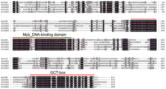 Comparative alignment of HaGLK, ZmGLK, and AtGLK amino acid sequences.