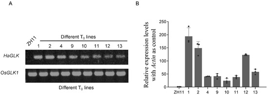 Molecular identification of HaGLK transgenic lines. (A) PCR identification of HaGLK transgenic rice; (B) relative expression of HaGLK by quantitative real-time PCR (qPCR). Each dot represents a biological replicate.