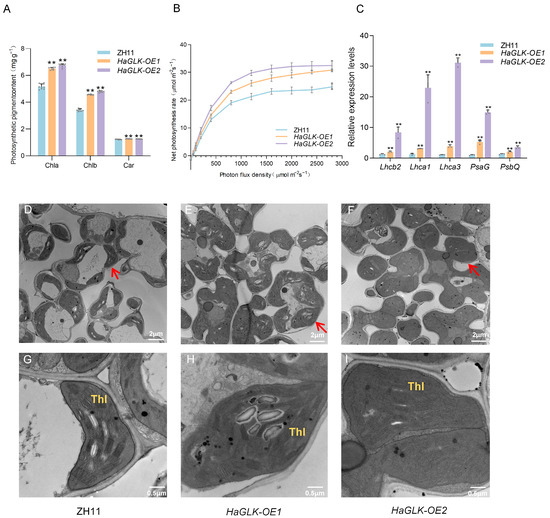 Photosynthesis-related indicator analysis of ZH11 and HaGLK transgenic lines. (A) Photosynthetic pigment content of flag leaves at the tillering stage (n = 9 biological replicates); (B) net photosynthesis rate curves fitted by the built-in light-response program (LI-COR 6800) with the CO2 concentration of 400 μmol mol−1 (n = 3 biological replicates); (C) relative expression of photosynthesis-related genes by qPCR (n = 3 biological replicates); (D–I) transmission electron micrographs of flag-leaf cross-sections of ZH11 and HaGLK transgenic lines; (D–F) chloroplasts in mesophyll cells, with arrows pointing to representative chloroplasts (bar = 2 μm); (G–I) enlarged micrographs of chloroplasts in mesophyll cells (bar = 0.5 μm). Thl: a stack of granal thylakoids. Data are means ± SD (Student’s t-tests, ** p < 0.01). Each dot represents a biological replicate.