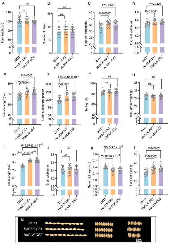 Agronomic trait analysis of ZH11 and HaGLK transgenic lines. (A) Plant height; (B) number of tillers; (C) flag-leaf length; (D) flag-leaf width; (E) panicle length; (F) grain number per panicle; (G) setting ratio; (H) 1000-grain weight; (I) grain length; (J) grain width; (K) grain thickness; (L) yield per plant; (I–K) ten grains in length (I), width (J), and thickness (K) between ZH11 and HaGLK transgenic lines; (M) comparison of grain shape (bar = 1 cm). Data are means ± SD (Student’s t-tests, ns: non-significance, n = 20 biological replicates). Each dot represents a biological replicate.